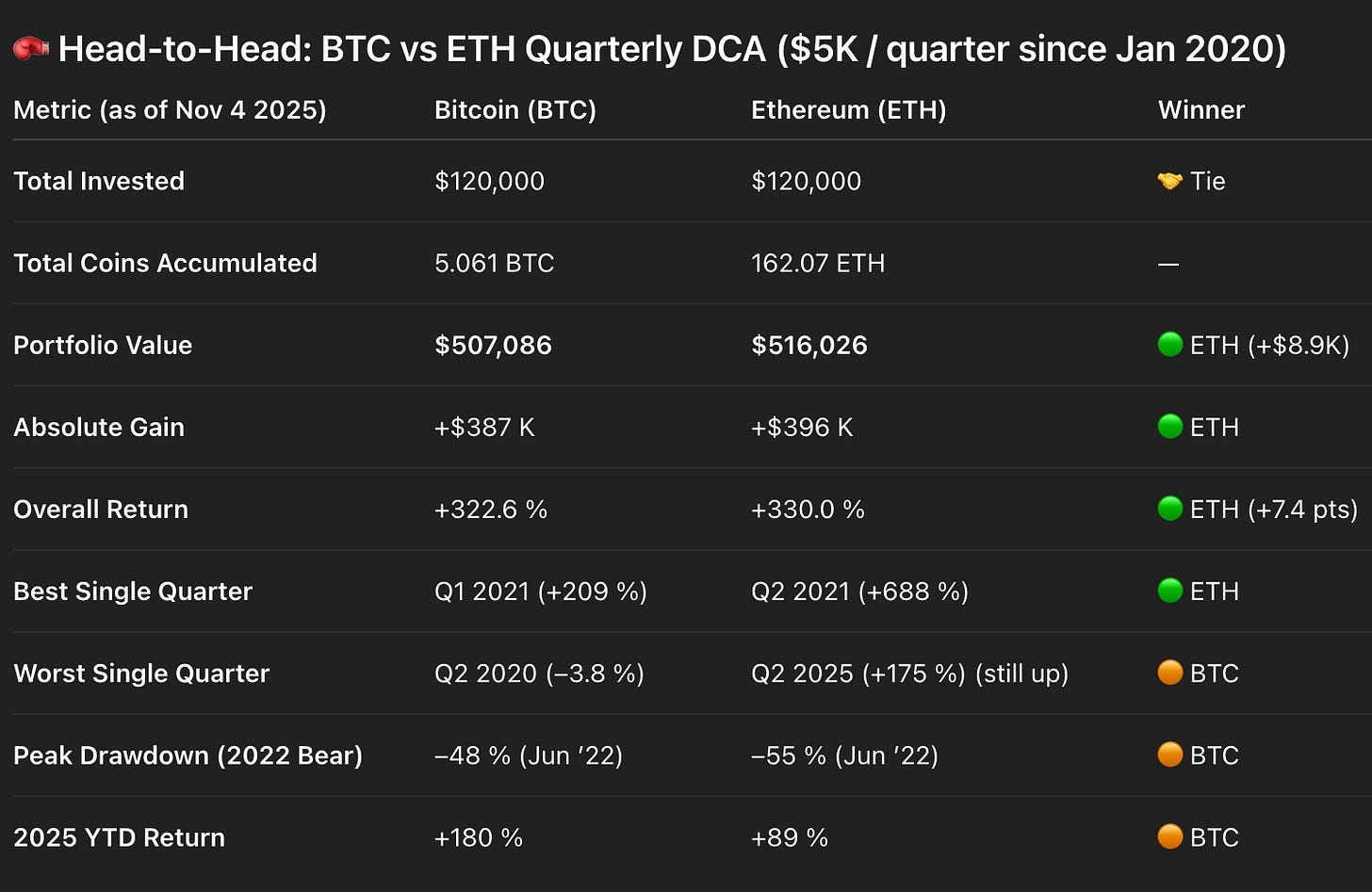 If you’re playing the game with a Player 2 you double this, so either BTC or ETH DCA’ing would have gotten you to a $1M+ portfolio by just clicking a few buttons and playing this game.