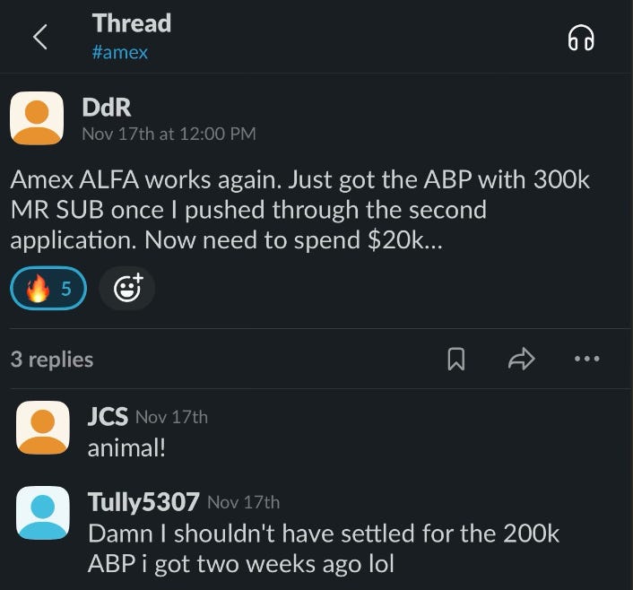 If you haven’t maxed out your $11,000 (1M Amex MR points cashed out at 1.1 cent per point via Amex Schwab Platinum) and $10,000 (1M Amex MR points cashed out at 1 cent per point via Amex Business Checking account)…